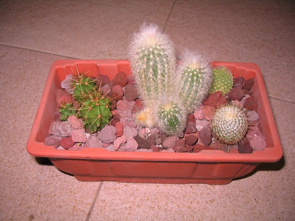 se non sbaglio hai scelto di mettere assieme opuntia, mammillaria, un colonnare ed echinocereus (non vedo bene)