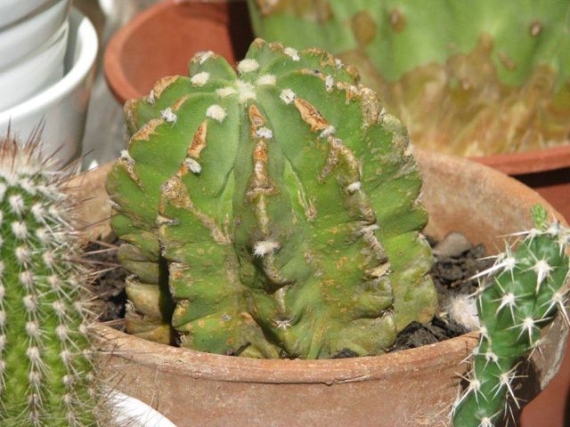 Come è facilmente osservabile, in questa pianta c'è qualche problema. Da neofita della coltivazione dele cactacee non so individuare la cause di ciò. Probabilmente il problema è dovuto al terreno di coltivazione (comune terriccio) o all'esposizione al sole (d'estate prende sole dalle 8 alle 16 circa - esposta a sud). Cosa mi consigiate di fare? La rinvaso con terriccio per piante grasse? C'è l'ho da 3/4 anni e negli ultimi due ha anche fiorito. Un'ultimo aiuto: qual'è il nome della pianta? Grazie in anticipo per i suggerimenti.