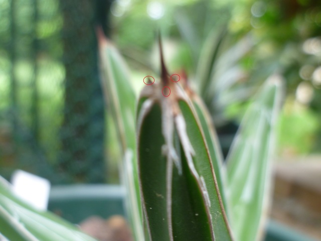 "espina de color casi negro, piramidal a lanceolada, gruesa, 2-2.8 cm de largo, ampliamente acanalada por arriba y redondeadamente aquillada por abajo, la base amplia y marcadamente decurrente sobre los ángulos de la hoja, usualmente con 3 dientes adyacentes que coronan a los ángulos de la hoja;"