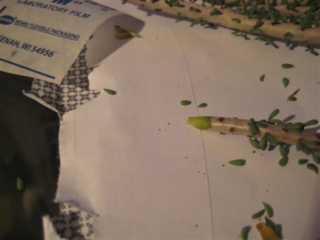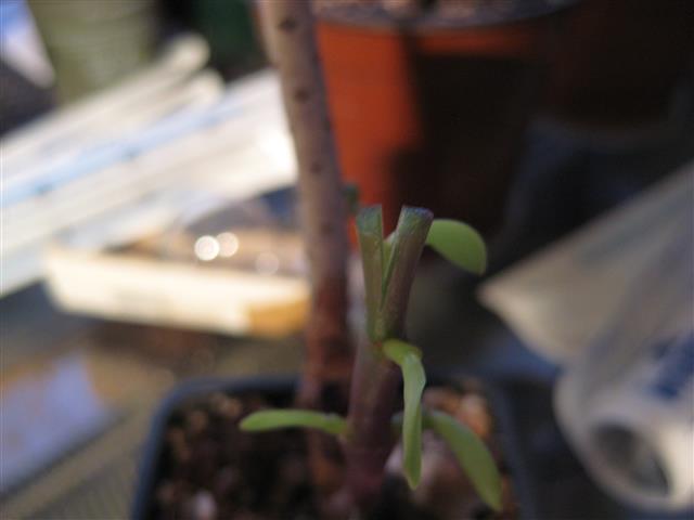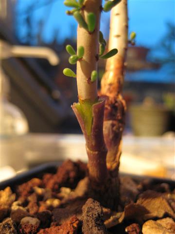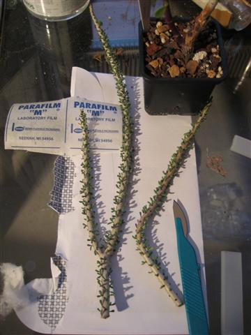 Negli innesti fatti sugli alberi e' facile identificare le varie parti del fusto, in particolare il tessuto del cambio, dove viene inserito l'innesto (se ho ben capito). Quando ho tagliato la Portulacaria non ho saputo distinguere alcuna parte (forse il rametto era troppo giovane), quindi ho inserito a caso.... non so come andra' a finire!