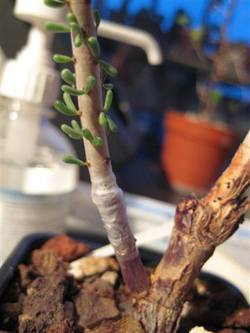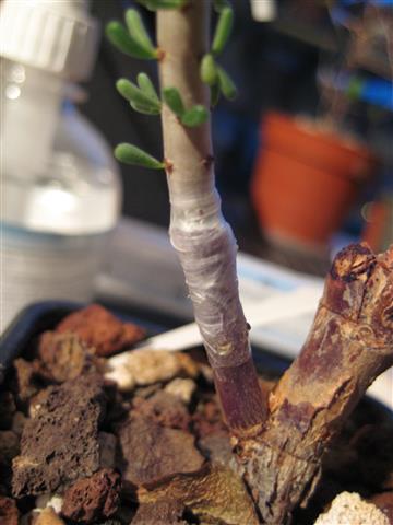 Questa tecnica di innesto e' quella usata comunemente per gli alberi da frutto.... io non ci avevo ancora provato. Mi e' avanzato un pezzetto di Ceraria, domani mi procuro un'altra Portulacaria e faccio un secondo innesto.