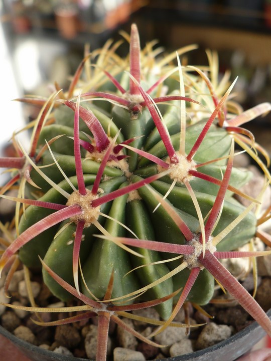 Dalla foto sembrano due piante cresciute vicino. Forse hanno le radici intrecciate a tal punto che ti fa pensare ad una radice unica. Comunque hai un Ferocactus latispinus e un latispinus v. flavispinus in quel vasetto.