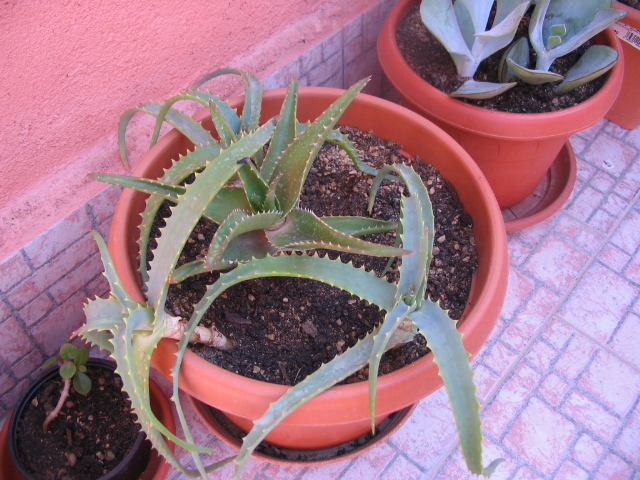 Nel vaso dell'aloe potrebbero esserci due varietà diverse di piante, ma sempre due aloe (io non vedo agavi).