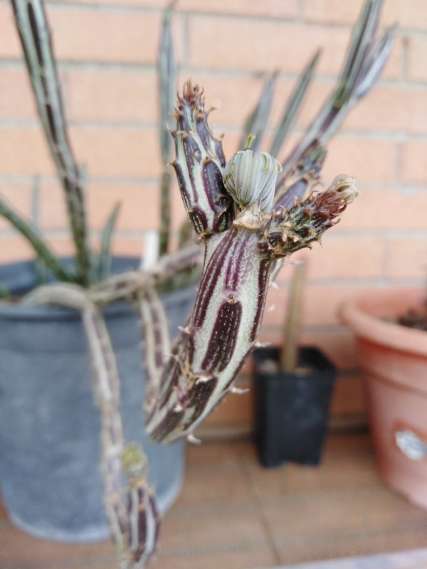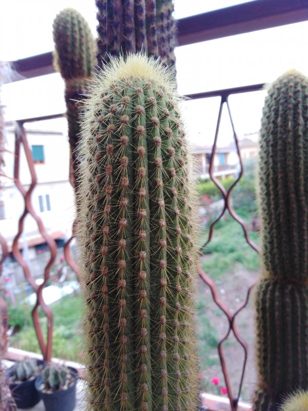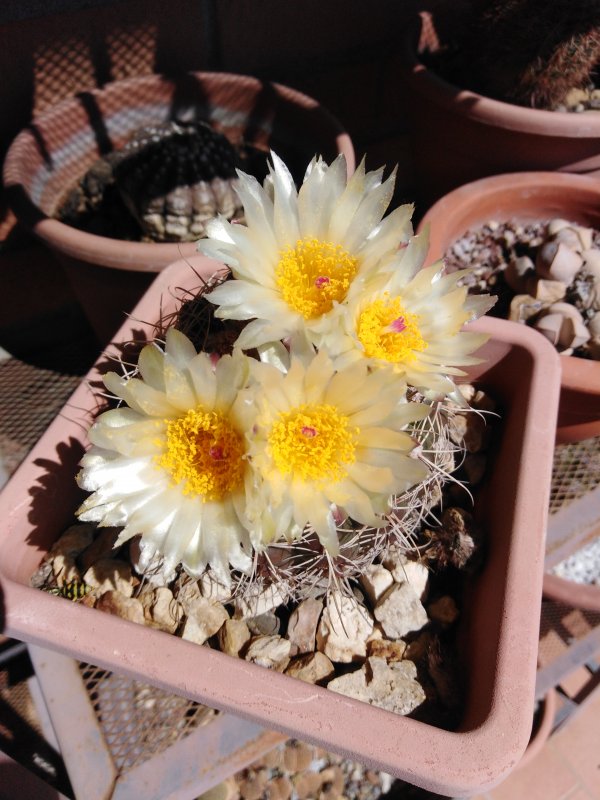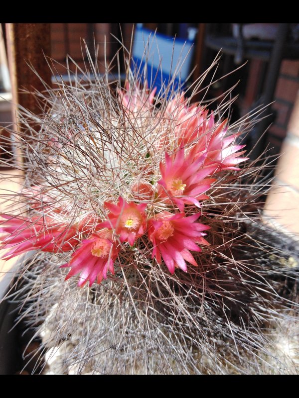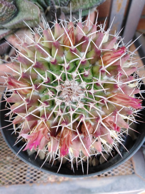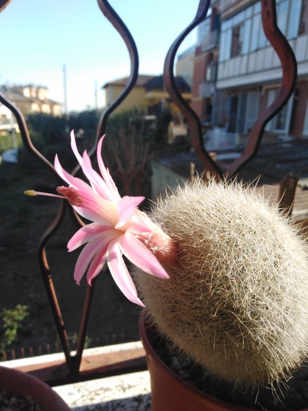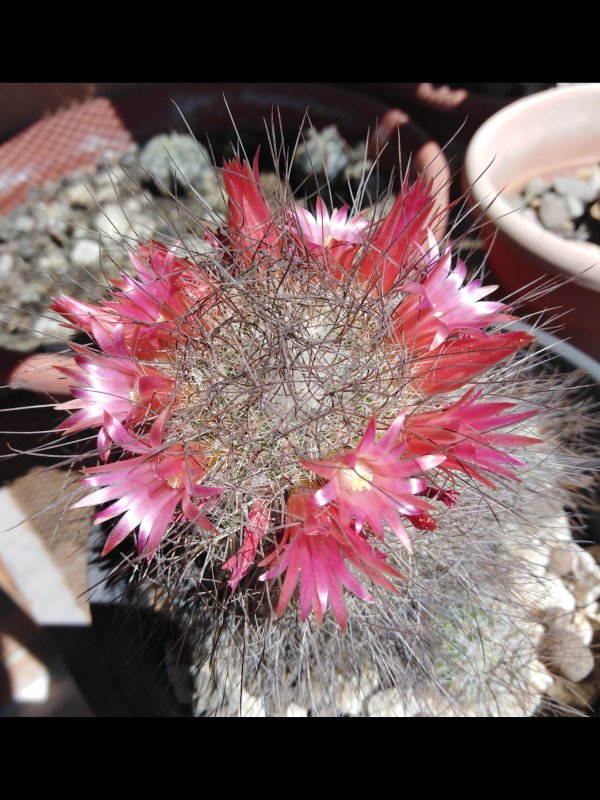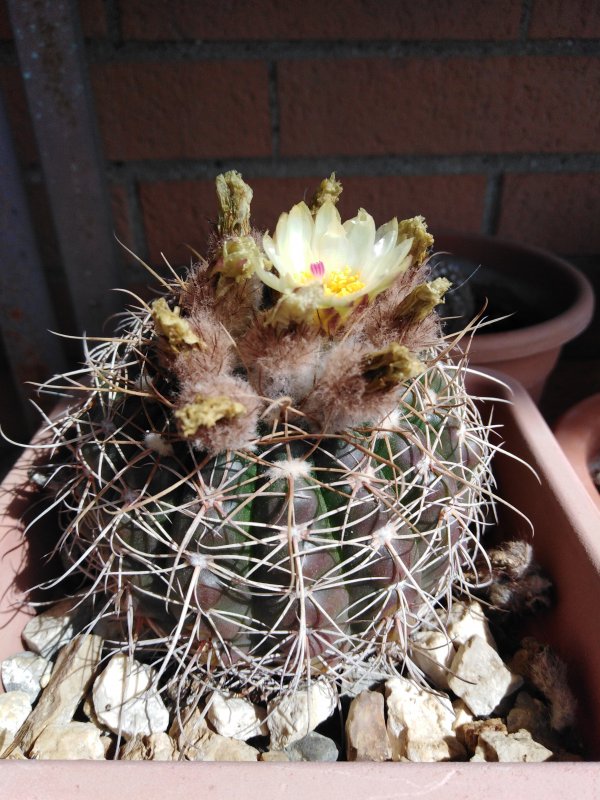 dalle spine, molto lunghe e morbide, sembra un eriosyce. dalla fioritura a cerchio in parte apicale sembra una mammillaria