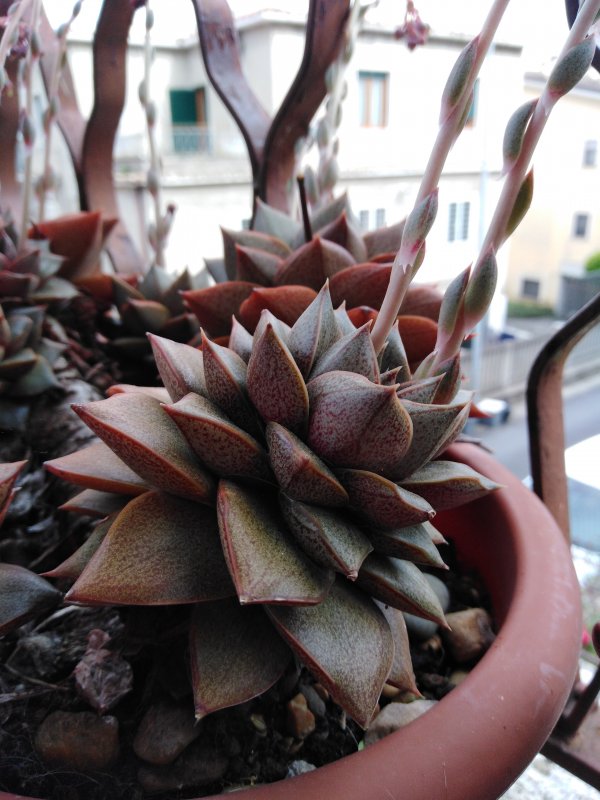 1 - Notocactus schlosseri 2 - Mammillaria sp. 3 - Chamaecereus ibrido 4 - Crassula rupestris ssp. marnierana 5 - Echeveria purpusorum 6 - Haworthia mutica 'otzenii'