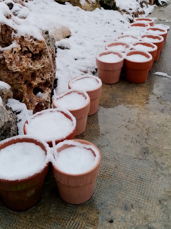 Non voglio assolutamente sottrarmi alle accuse di scarsa imprudenza, ma in questo caso ho agito piuttosto serenamente. Visto che già li avevo messi all'acqua a fine dicembre (ed erano seguite temperature rigide) e intorno a metà gennaio senza riscontrare il minimo danno, questa volta ero molto più tranquillo. Questa volta ho messo all'acqua ( o meglio alla neve) anche gli Sclerocactus che fino ad ora avevo tenuto asciutti, ma devo dire che questi sono bruttini avrei dovuto bagnare prima anche loro.