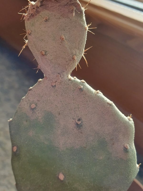 Ho questa pianta che credo sia una pala di fico d'india (me l'hanno data, non sono sicura di ricordare correttamente) che bagno quando mi sembra rinsecchirsi (non ho proprio il pollice verde, me ne hanno date due identiche in passato, una è morta per troppa acqua e una per troppa poca, sto cercando di migliorare! ). La tengo sul davanzale della finestra, che è esposta sud-est. I primi due anni nessun problema, ha messo anche la piccola pala sopra ed ero felicissima di non averla uccisa ma addirittura averle permesso di crescere, ma ora è venuta tutta grigia così e non capisco se è cotta dal sole (e quindi se dovrei provare a cambiarle posto) oppure se si è presa qualche malattia (e quindi dovrei capire come curarla).