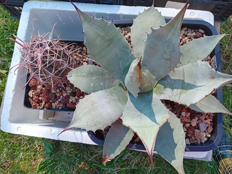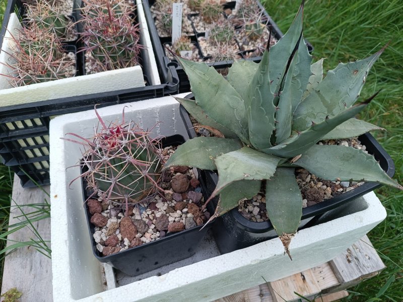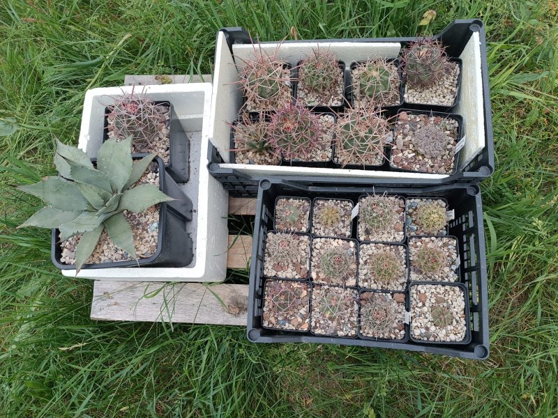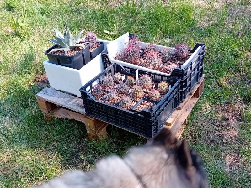 Le cassette sono state rialzate su dei bancali, i vasi sono zuppi d'acqua e la maggior parte di loro si è reidrata. Il thelocactus sembra non abbia reagito alle abbondanti piogge. Sarà spacciato?