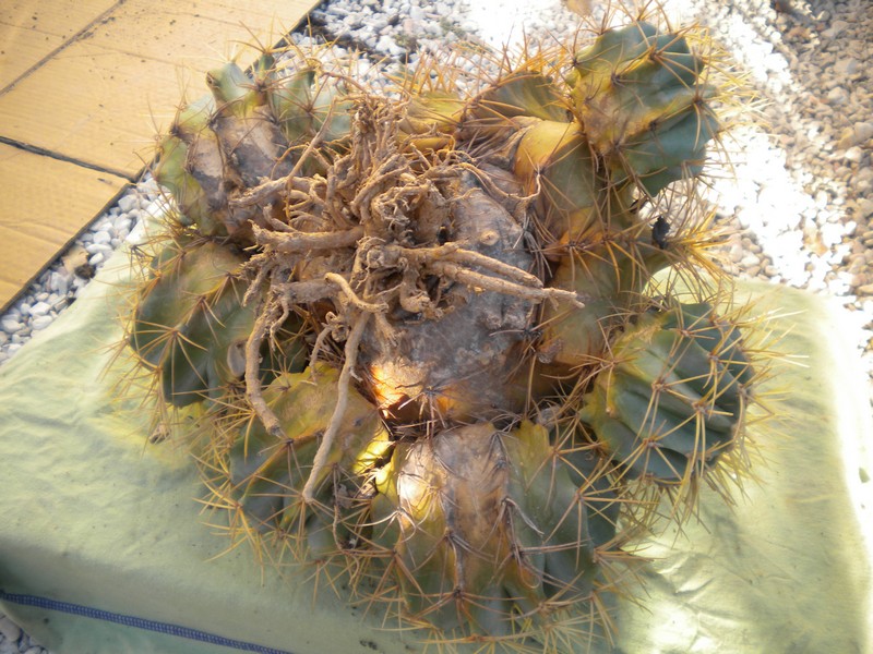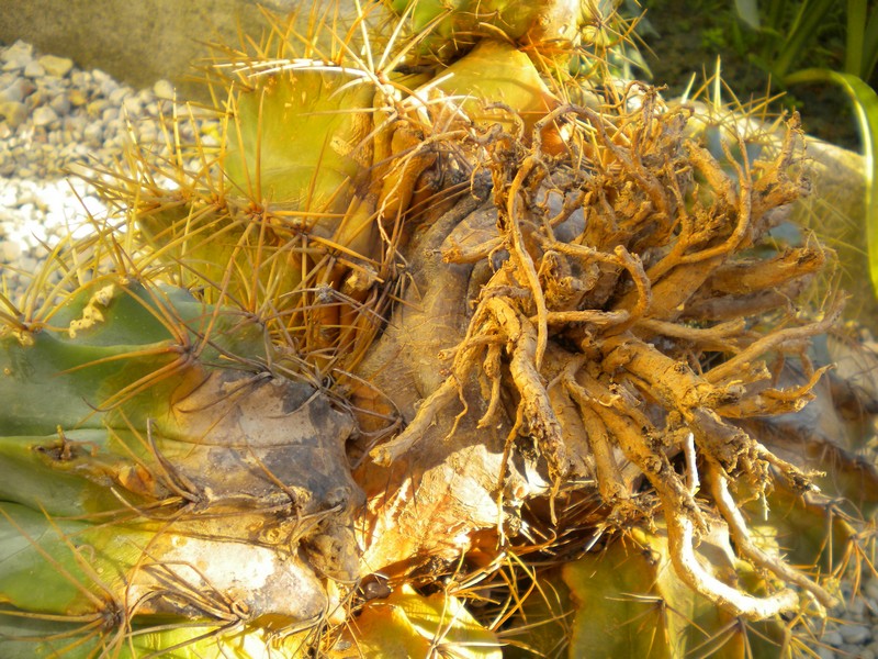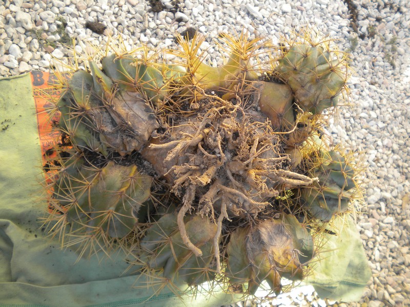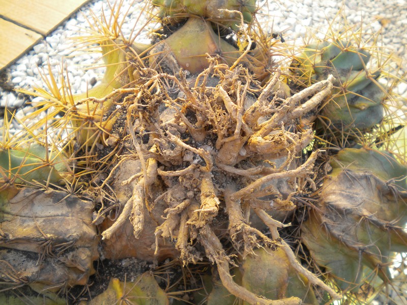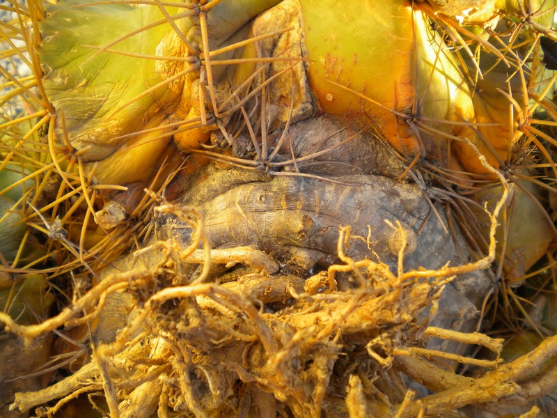 Ho visto che al centro delle radici c'era un terreno molto più duro (sicuramente di origine) e attorno invece c'era terreno specifico per cactus (di quello da fioristi) ma senza materiale inerte a sufficienza.