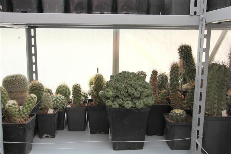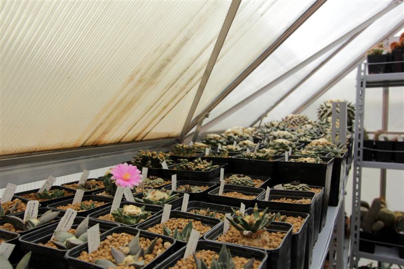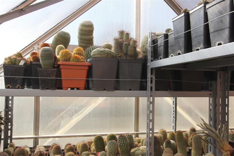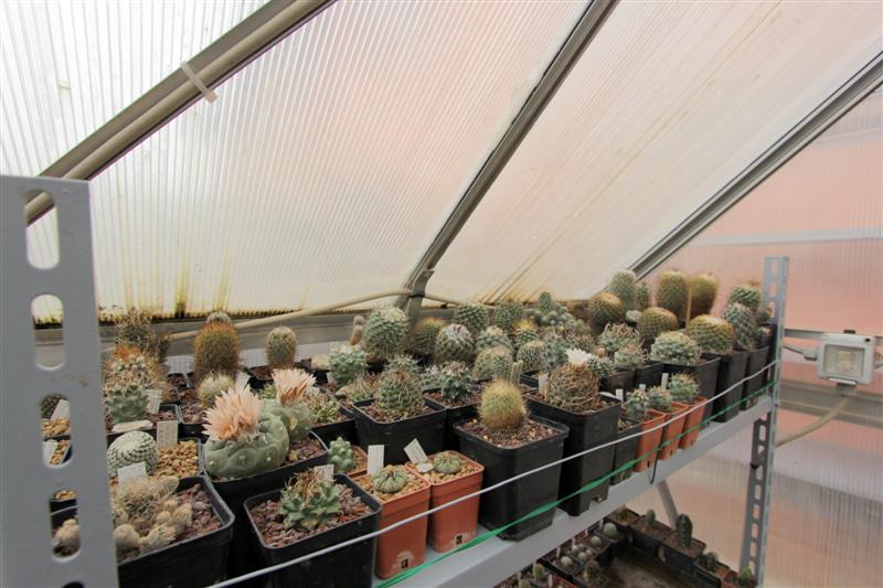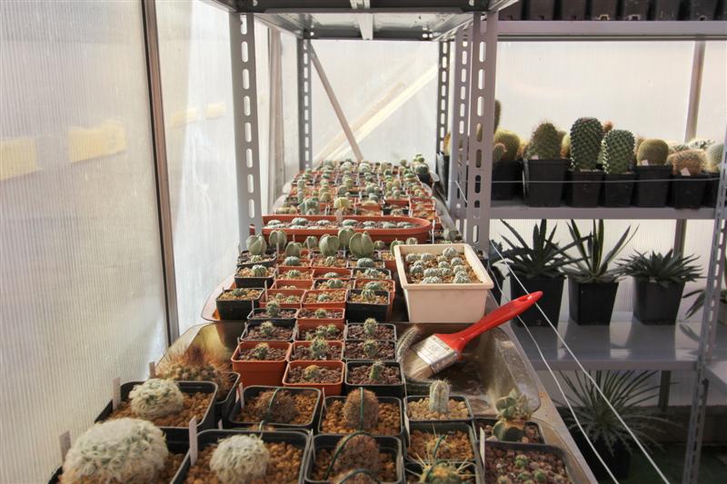 Serra calda in primo piano alcune Mammillarrie bocasana a radicare e in fondo le semine 2013