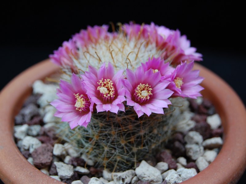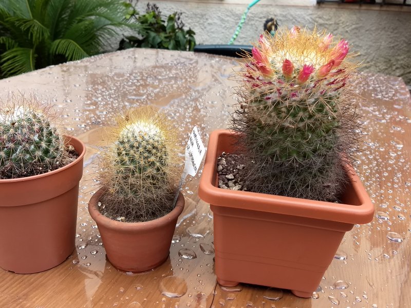 Mammillaria rekoi ssp. leptacantha la terza e la quinta, Mammillaria bombycina l'altra.