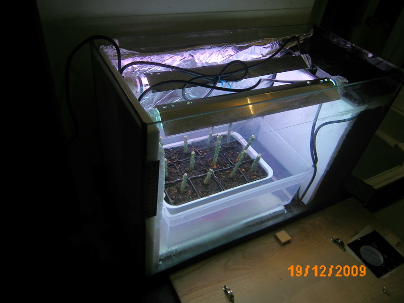 E' facile Jocactus, provo a mettere 2 foto pessime. A luce spenta proverò poi a far vedere l'esterno. In una si vede in basso il nuovo coperchio in legno con la presa d'aria chiusa da rete. Devo ancora finire di rivestire il polistirolo con foglio di alluminio. 2 lampade, plant-power e daylight brilliant da 15 w, con riflettori. Misure 60x30x45, se andrà bene staccherò il filtro che occupa 10 cm. Temperatura interna tra 30 e 16,17