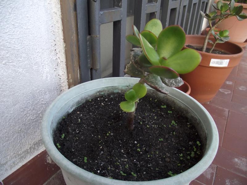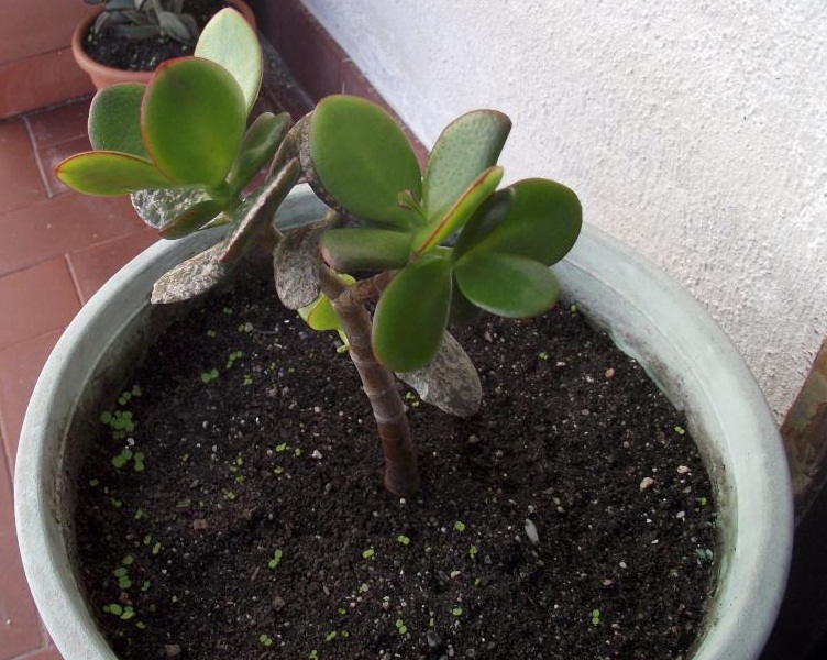 Due talee di Crassula ovata prese lo stesso giorno e dalla stessa pianta. Quella più piccola in plastica, quella con due fusti in coccio. Stesso sole, stesso vento, stessa aria, stessa acqua una volta a settimana, solo suolo diverso (direte: e vabbe' allora... eppure!): terra di giardino presa almeno 8 anni fa e mai concimata se non dalla pioggia (usata per altre piante precedentemente e lasciata alle erbacce nell'ultimo anno) per la piccola, stessa terra più torba nel coccio. Risultato: la piccola è cresciuta, ha fatto un rametto nuovo e cresce a vista d'occhio, la grande immobile.