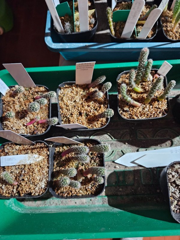 Letto di semina di 0,5cm 100% minerale, strato intermedio 80% minerale. Semina superficiale, nessun aggiustamento o riposizionamento. Temperature controllate min 17-20°, max 25-29. In germinatoio fino a fine luglio, da agosto in terrazzo coperto, esposto a sud, a circa 2m dal bordo, iniziato a prendere il sole diretto gradualmente e progressivamente dal 20/8 (per effetto dell'abbassamento dell'elevazione solare stagionale). Risultato, ero abbastanza soddisfatto, pur non avendo termini di paragone fino ad ora, ma come neofito, essendo al secondo anno con le semine di cactus e al primo con un germinatoio, sono andato un po' a caso, sperimentando, leggendo e documentandomi qua e là. Sicuramente l'errore più evidente è stato che li ho tenuti troppo in germinatoio e quindi hanno eziolato..... come purtroppo ahimè accaduto anche ad alcuni degli altri generi che ho seminato quest'anno....