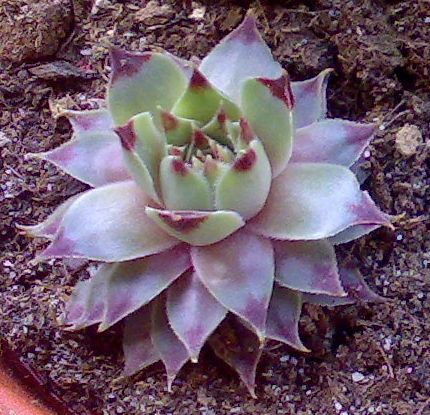 "Pianta succulenta a forma di rosetta con foglie verdi alla base, rosso-brune all'apice"