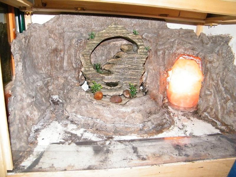 Dunque, il giardino è formato da 3 pareti in finta roccia, cartapesta ricoperta con vernice atossica e idro resistente, in centro c'è incastonata una fontanella e sull'angolo in fondo a destra c'è una lampada di sale.Le dimensioni della base sono 65 x 40 e l'altezza posso portarla a circa 50 cm. Il giardino dovrà essere coperto con una teca in vetro già esistente ma da modificare; la teca non può essere eliminata causa Silvestro (micio di 9 Kg). Per l'illuminazione pensavo di mettere o un tubo al neon a luce solare oppure delle strisce a led a spettro adeguato. Pensavo inoltre di fare un piccolo impianto di irrigazione. Cosa ne pensate?