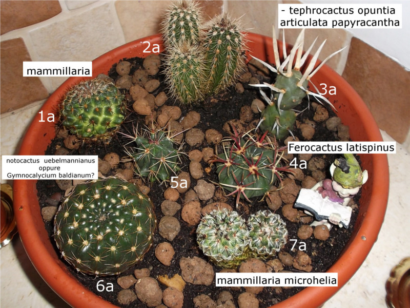 ok... su segnalazioni di Enzo e Giorgio (che ringrazio per i consigli) ho tolto i pleiospilos e la crassula hobbit... sostituendole nel gruppetto... con una opuntia articolata papyrachanta e un'altra ancora da identificare...(5a) poi volevo chiedervi se la 6a è notocactus o gymnocalycium...e le colonnari (2a)?