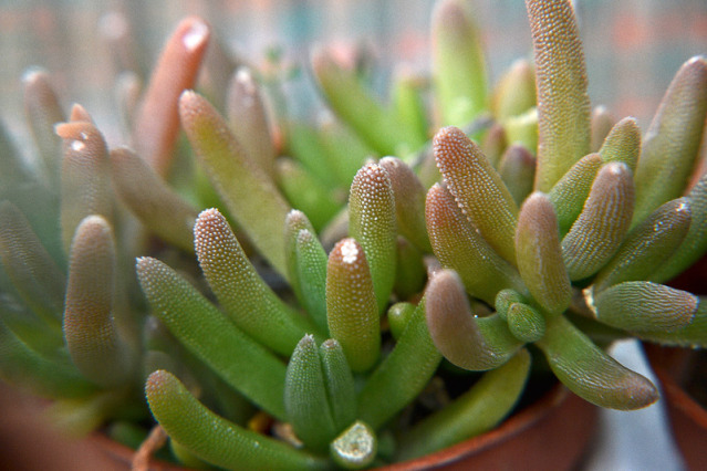Il secondo me l'ha regalato un'amica che lo possiede da anni convinta che sia Delosperma cooperi, lo davo già per scontato perché difficilmente si sbaglia. Ma evidentemente è così, perché facendo delle ricerche, sembra proprio che la foglia con quelle macchioline a rilievo della prima pianta appartenga proprio ad un cooperi Sorriso ... confermate?