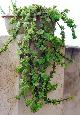 Ha piccole foglie tonde verdi e carnose,i rami sono abbastanza flessibili e alla base sembrano formati da anelli...