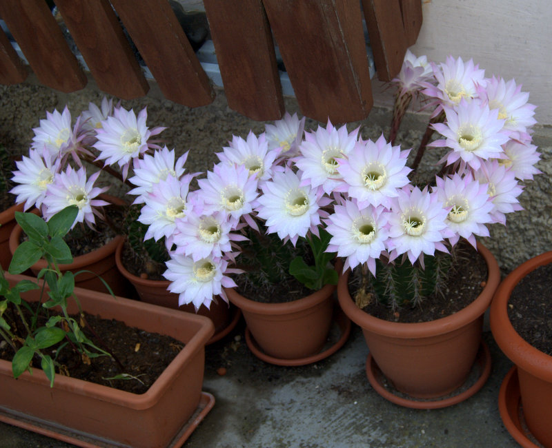 Sono fiorite: 1, 2, 6, 13. La prima ha fatto fiori bianchi, purtroppo sono fiorite di notte e non gli ho visti bene, però in base alla forma sembravano simili ai fiori della 2°.