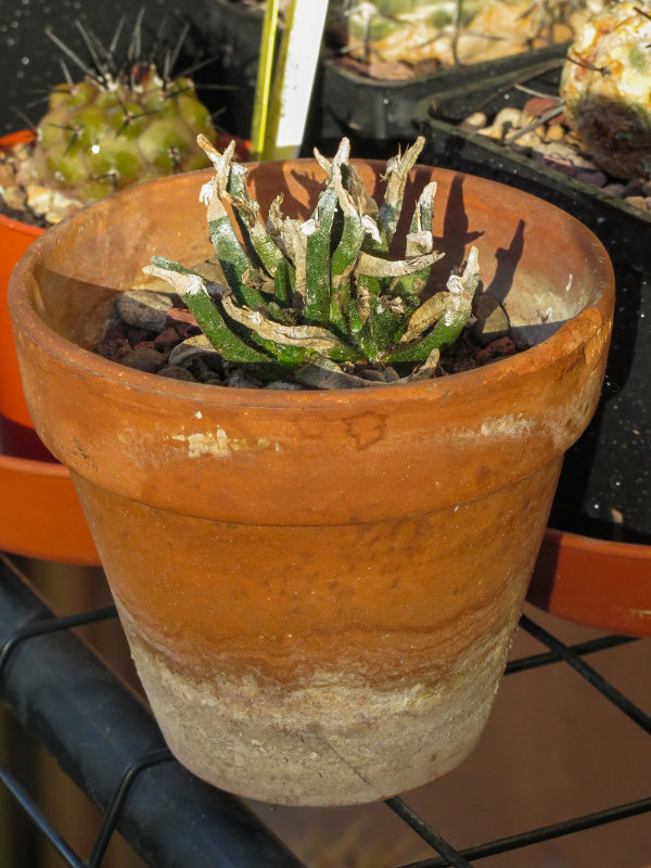 ho ripreso sotto la mia custodia due piante di Ariocarpus (kotschoubeyanus e agavoides) che avevo dato in affidamento ai miei genitori ormai da un po' di tempo. Sono vecchie piu' di 10 anni (forse anche 15... se notate il prezzo sul cartellino del kotschobeyanus e' in lire) e sono rimaste sempre nello stesso vasetto... che vedo ormai un po' piccolo vista la radice a fittone degli ariocarpus. Mi piacerebbe rinvasarli ma ho paura di comprometterne la fioritura del periodo autunnale.