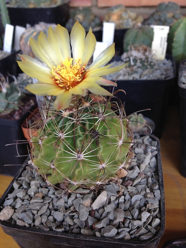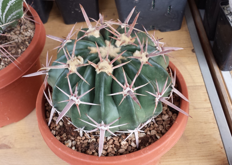 Sull'Echinocactus texensis ho qualche dubbio. Guardando su internet ho visto altre foto del texensis e la spina non mi sembra uguale. Praticamente la mia pianta ha una spina centrale + 7 spine laterali, 3 laterali e 1 centrale. Invece su quasi tutte le foto del texensis su internet manca la spina laterale centrale (quella rivolta in alto).