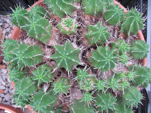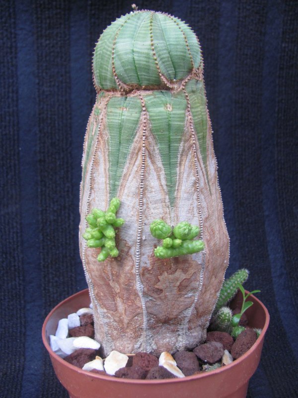 La crescita di altre teste sulla Euphorbia obesa a meta del fusto e dato dalla esuberanza (forza di crescita della pianta) che trovato sfogo in un punto più debole della pianta molto probabilmente o in seguito alla caduta della pianta, come riferisce la proprietaria, oppure un isetto ha prodotto un taglio sulla pianta o semplicemente in quel punto il tessuto è più debole.