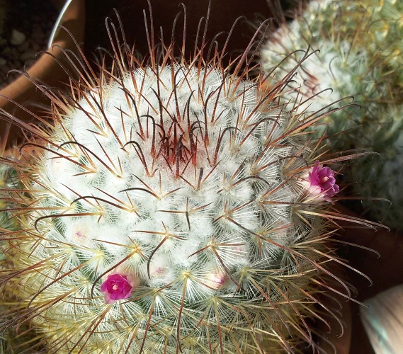 Lo scorso anno a Murabilia (LU) ho acquistato in offerta (5 piante 10 euro) anche queste due mammillarie, l'altra si intravede sullo sfondo, e dopo una lunghissima "purga" sono finalmente in fiore.