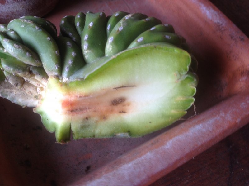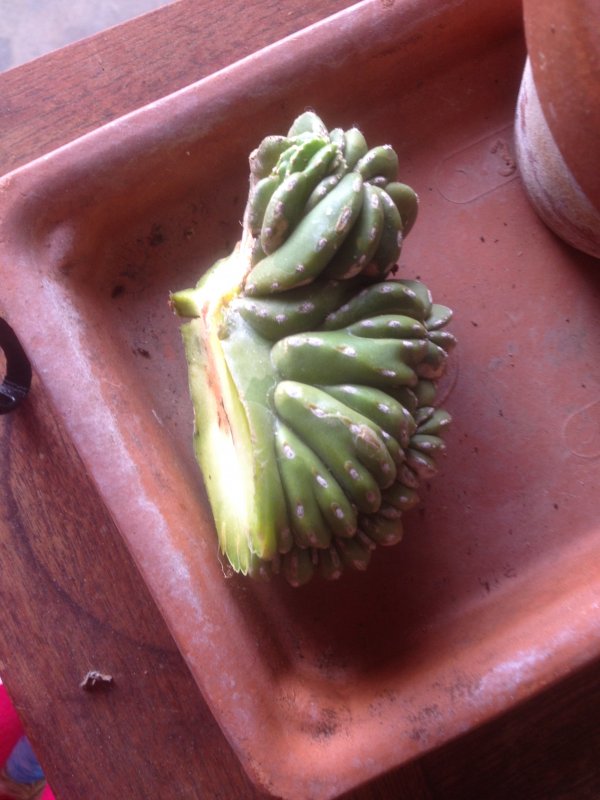 Quello che vedete è ciò che rimane di una magnifica pianta che al ritorno dalle vacanze ho trovato marcita. Ho asportato tutta la parte avariata, secondo voi devo continuare? Aspetterò che si asciughi, poi la poggerò sulla pomice e speriamo bene. Sarei tentata di dividerla in due, farei bene?