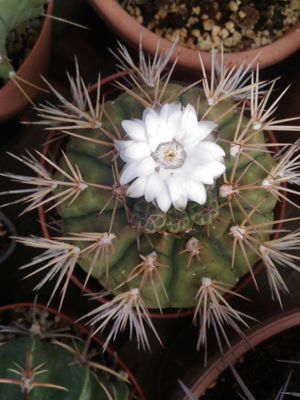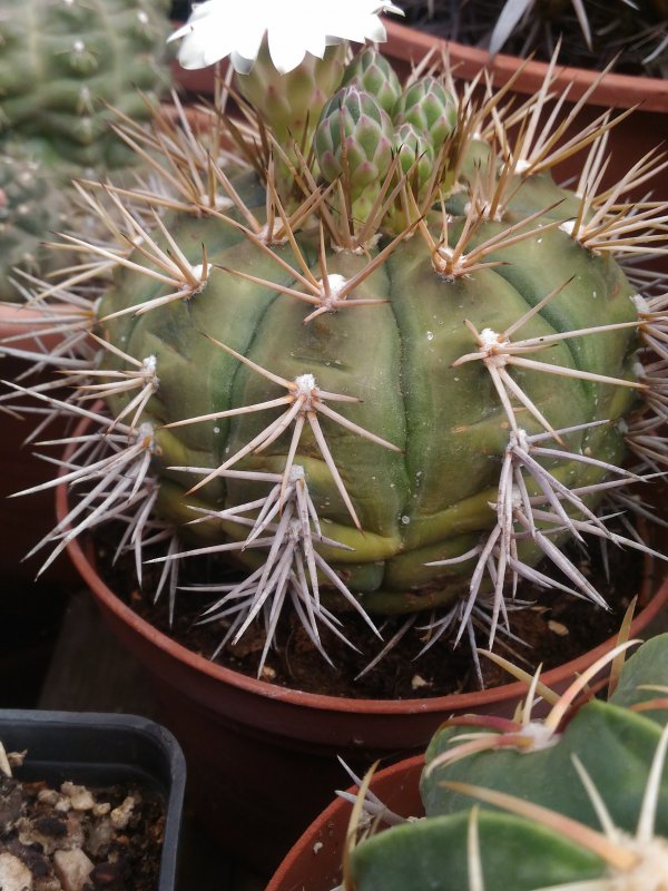 Ringrazio Alfredo per la sua risposta, immagino che potrebbe essere un G. eurypleurum, anche se non puro perchè nel mio caso i fiori non sono crestati ma solo schiacciati dalle spine, come ho potuto notare già nei boccioli. Inoltre i fiori non sono bianchi al 100%, c'è una seppur minima parte di rosa (sempre che ciò possa incidere!)