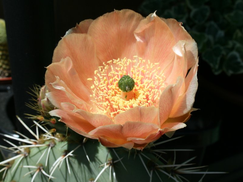 tempo fa mi avevate identificata questa opuntia come phaeacantha...fino ad allora,avevo sospettato fosse una engelmannii...ma il dubbio permane,visto che nella foto la somiglianza è notevole. Questa qui ha spine biancastre e fa fiori arancio slavato...