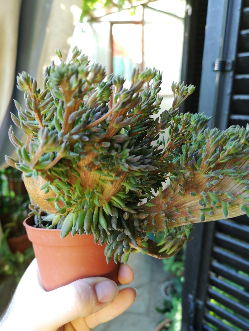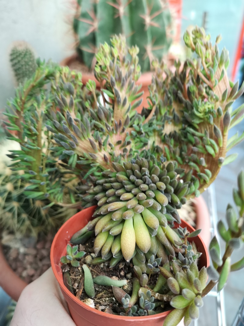 E' una Sinocrassula yunnanensis f. cristata. Esponila gradualmente al sole migliora molto. Io metterei la solita composta 1/3 x tre.