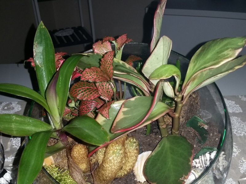 Una specie di Peperomia a destra ed una Fittonia quella con le foglie tipo “retato”. Come diceva Massimo subito via la Mammillaria da tenere sola. Poi anche le altre ognuna nel proprio vaso con terreno più organico rispetto alla Mammillaria.