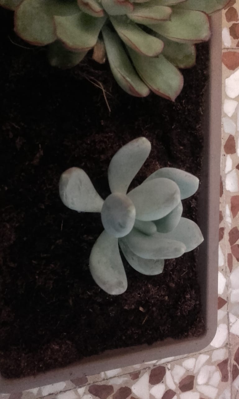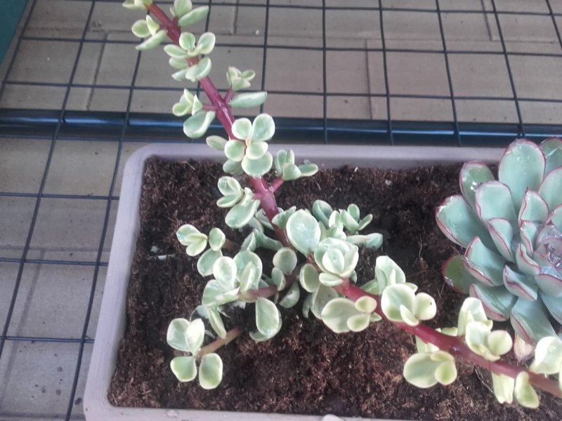 Sicuramente Sara intendeva Pachyphytum oviferum. Pachyphytum confermo, oviferum non son sicura. Concordo su Echeveria (no, non è un sempervivum, tranquillo), ma anche io non so individuare la specie, e Portulacaria afra variegata. È variegata per le foglie variegate, quella non variegata ce le ha verdi e basta. Il fusto è rosso in entrambe.