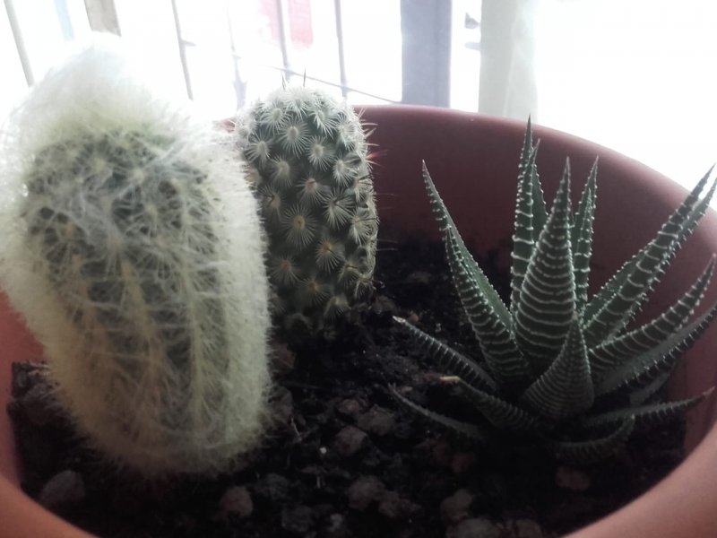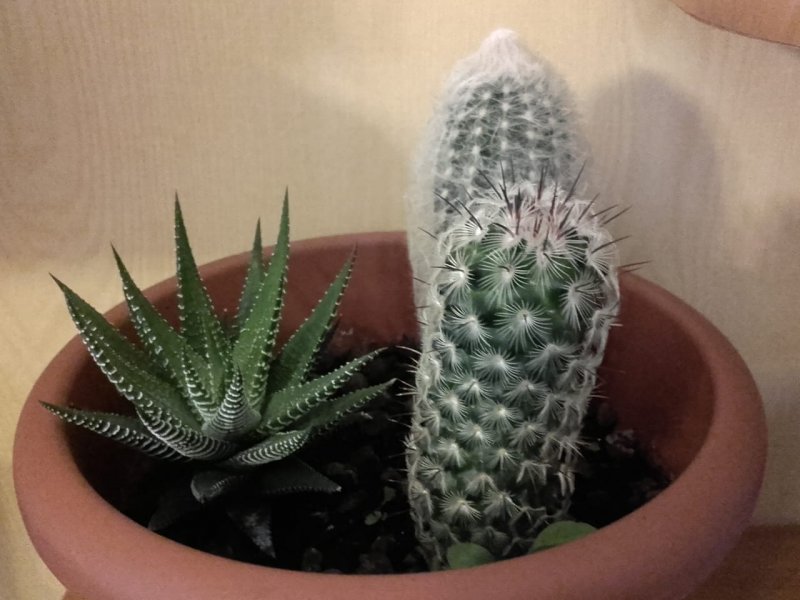 Poi dovrebbero esserci, Espostoa lanata f. nana e Mammillaria microhelia insieme forse una un Aloe aristata.